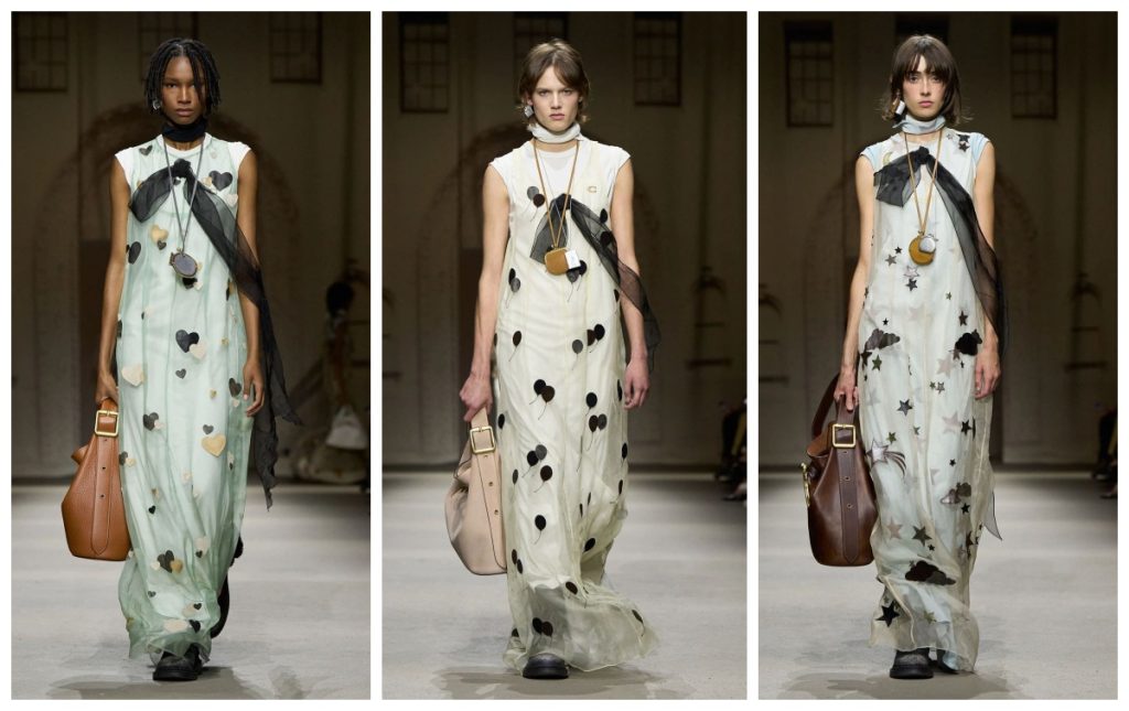 Aksesori menjadi pusat perhatian utama dalam show ini, seperti halnya identitas khas Coach. Tas-tas ikonik seperti Barrel Bag, Bleecker Bucket, dan Tabby Clutch dihadirkan dalam versi yang direinterpretasi, dengan bahan kulit lembut, suede yang diolah dengan finishing foil metalik, serta denim dan material kerja ulang yang memberi kesan vintage sekaligus modern. Sepatu, mulai dari Soho Sneakers yang didesain ulang dengan tali pengganti tali sepatu, sampai boots bergaya workwear, mempertegas kesan edgy dan praktis. Perhiasan unik seperti liontin berbentuk hati, miniatur buku, dan kunci bergaya Victorian menambah dimensi narasi romantis yang hangat dan personal, memperkaya koleksi dengan cerita kecil namun bermakna.