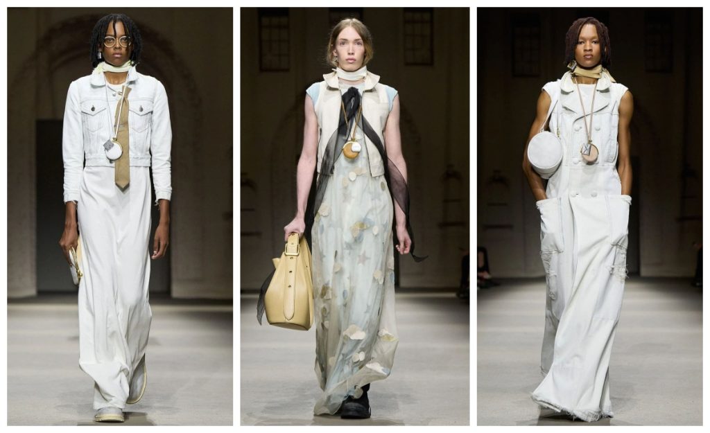 Runway dipenuhi dengan siluet yang menyatukan estetika klasik dan modern. Celana oversized yang longgar berpadu dengan blazer cropped dan jaket moto bertekstur unik, menciptakan perpaduan kasual dan edgy. Kontrasnya muncul dari keindahan busana berbahan halus seperti gaun tulle dan organza yang dilapisi dengan aplikasi bertemakan bintang, balon, dan awan, menyuntikkan sentuhan whimsical dan romantis ke koleksi yang didominasi oleh elemen-elemen urban dan tangguh tersebut. Hal ini menciptakan keseimbangan yang membuat setiap look terasa segar dan penuh kejutan.