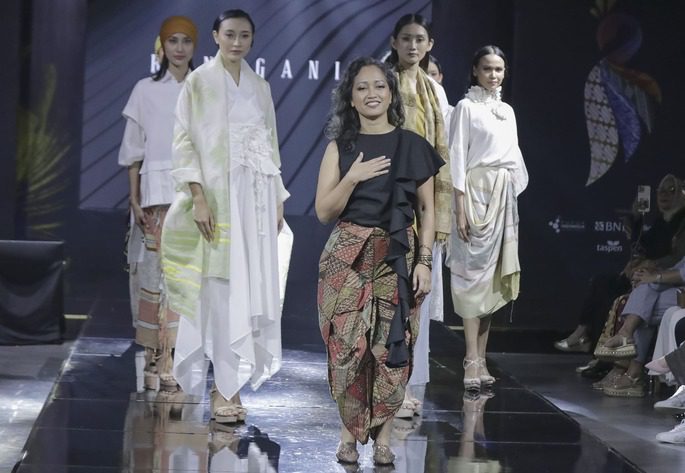 Rengganis memperagakan koleksinya yang diberi judul Longevity dalam acara Kawfest, atau Kelana Wastra Fashion Festival yang bertempat di Sarinah Jakarta pada hari Jumat (26/4) yang diselenggarakan oleh 6 Kementrian BUMN.