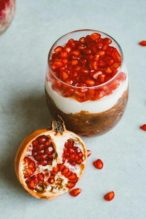 Perpaduan puding chia cokelat yang lembut dan kaya rasa, lapisan krim yang ringan, dan biji buah delima yang segar menciptakan sensasi rasa yang unik.