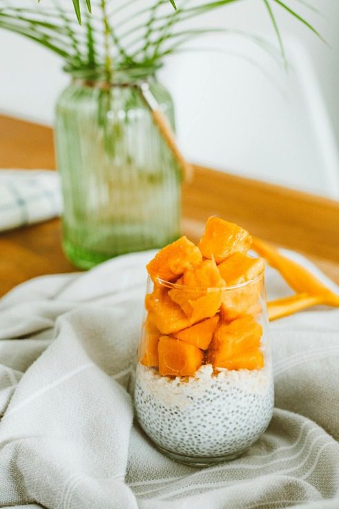 Puding chia yang satu ini menawarkan sensasi rasa tropis yang menyegarkan. Perpaduan mangga dan jeruk memberikan cita rasa manis dan sedikit asam yang membangkitkan selera.