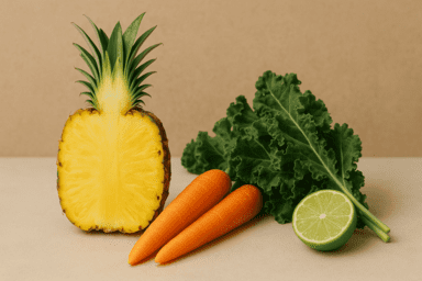 Jus ini tidak hanya menyegarkan, tapi juga kaya akan nutrisi penting. Jeruk mengandung vitamin C yang tinggi, membantu meningkatkan daya tahan tubuh dan memperbaiki kulit. Nanas dan wortel menambah rasa manis alami serta kaya beta-karoten dan vitamin A yang baik untuk mata dan kulit. Kale sebagai sayuran superfood kaya vitamin K, kalsium, zat besi, dan antioksidan yang membantu menjaga kesehatan tulang dan melawan radikal bebas.